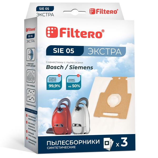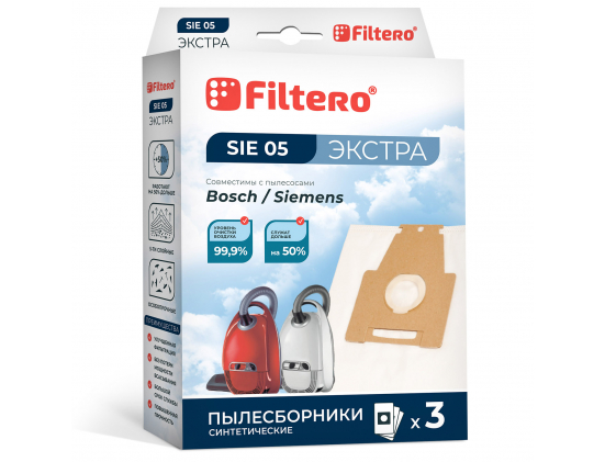 Мешок-пылесборник Filtero SIE 05 Экстра совместим с большим количеством моделей пылесосов брендов Bosch и Siemens. Прочное синтетическое волокно, из которого сделан пылесборник, состоит из пяти слоев. Благодаря этому изделие устойчиво к влажной среде и способно удержать до 50% мельчайшей пыли. В комплект Filtero SIE 05 Экстра входят три мешка-пылесборника белого цвета. Удобная и надежная рамка клапана сделана из прочного картона, это дает возможность без труда извлечь заполненный мешок и вставить чистый пылесборник. Многоразовое использование Filtero SIE 05 Экстра не допускается.