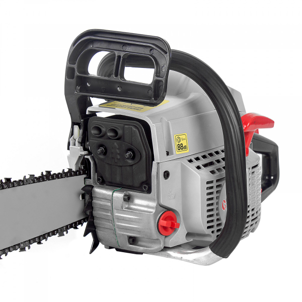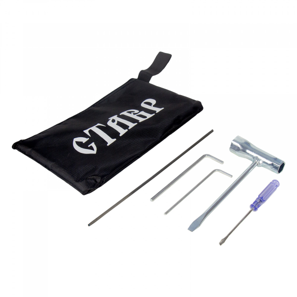 Комплектация: шина, цепь, отвертка, свечной ключ, шестигранный ключ 2шт., напильник, защитный чехол шины, чехол для инструмента, емкость для приготовления смеси (бензин+масло)