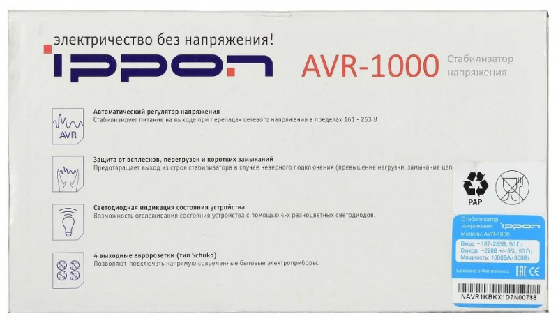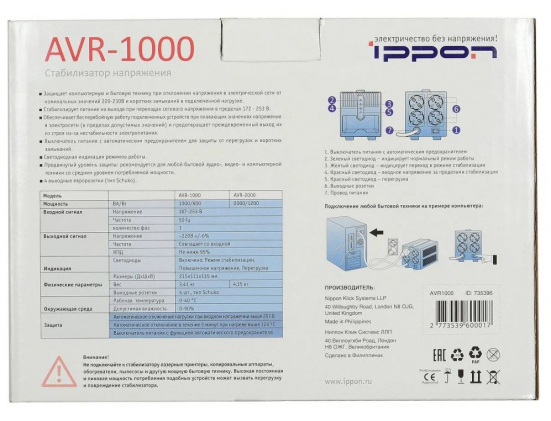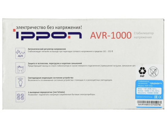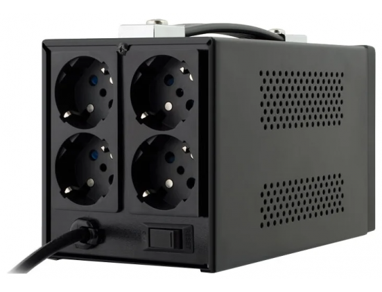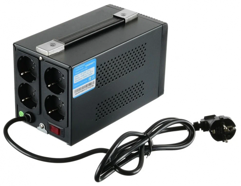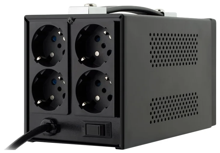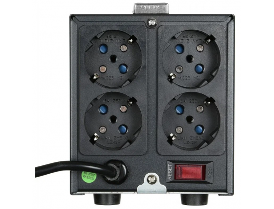 Дополнительная информация - светодиодная индикация: зеленый – нормальный (линейный) режим работы; желтый – работа в режиме стабилизации; красный – входное напряжение за пределами стабилизации/перегрузка; мин. выходное напряжение (фазное): 207 В; макс. входное напряжение (рабочее): 253 В; макс. входная частота: 60 Гц; мин. входная частота: 50 Гц; мин. относительная влажность: 0 %; количество выходных розеток (общее): 4 шт.