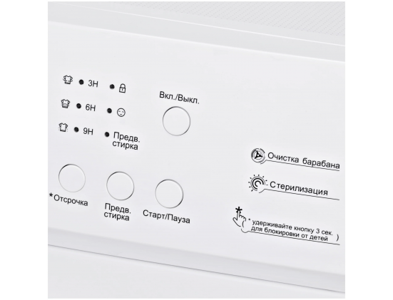 Дополнительные функции - выбор скорости отжима, выбор температуры стирки, контроль баланса, контроль за уровнем пены, отложенный старт, сигнал окончания стирки