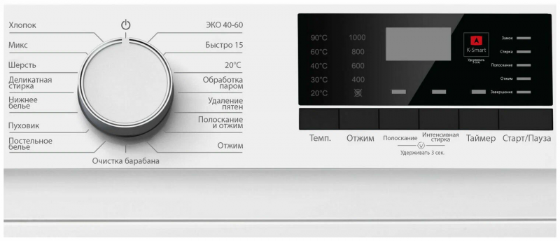Программы - быстрая стирка, дополнительное полоскание, ежедневная стирка, замачивание, интенсивная стирка, отжим, полоскание, ручная стирка, стирка деликатных тканей, стирка детских вещей, стирка пуховых вещей, стирка синтетики, стирка смешанных тканей, стирка хлопка, стирка черных вещей, стирка шерсти, удаление пятен, экономичная программа, Полоскание + отжим, Слив, обработка паром, отжим, полоскание