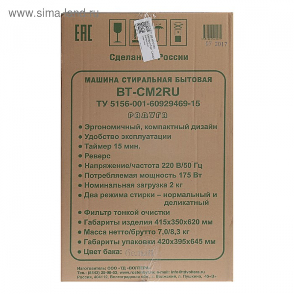 Дополнительная информация - реверсивный, поворотно-кратковременный режим работы при стирке; объем бака 23 литров; таймер стирки