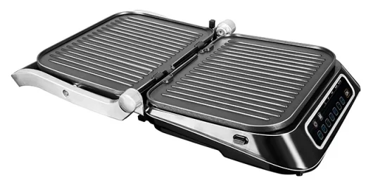 Дополнительная информация - открытие на 180°; съемные панели 30,7x23,7 см, можно мыть в посудомоечной машине; нагревательные элементы встроены в панели; автоматическое определение времени приготовления; автоматическое определение толщины закладываемого продукта; 7 автоматических программ: разморозка/разогрев, бекон, птица, сосиски, мясо, рыба, котлеты и бургеры; ручной режим; индикация степени прожарки; максимальная температура нагрева 240°С; отсек для хранения шнура