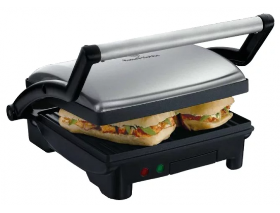 Многофункциональный прибор сочетает в себе гриль, противень и бутербродницу (панини). На этом компактном устройстве вы сможете жарить мясо и готовить овощи-гриль, омлет или вкуснейшие закрытые бутерброды, просто меняя положение панели. Идеальный вариант, экономящий место на кухне и ваше время. Бутербродница рассчитана на приготовление 2-3-х бутербродов, а гриль для приготовления мяса и овощей — на 5 порций. Предусмотрен встроенный поддон для сбора избыточной жидкости. Легко очищаемые пластины имеют антипригарное покрытие. Имеется отсек для хранения шнура.