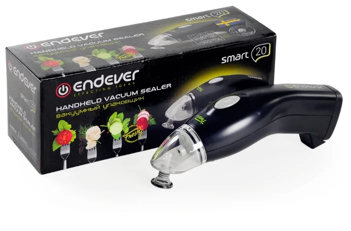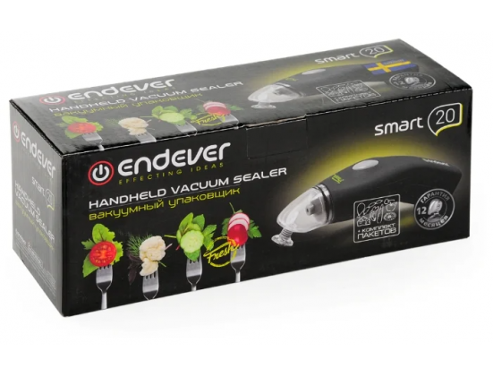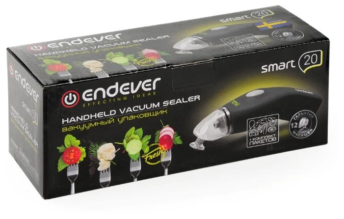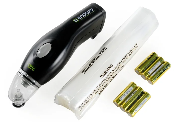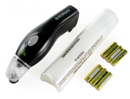 Вакуумный упаковщик работает от батареек АА, в комплект входят пакеты (20 штук).