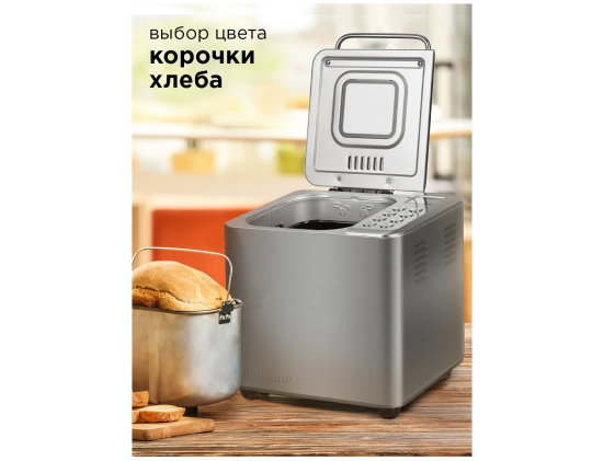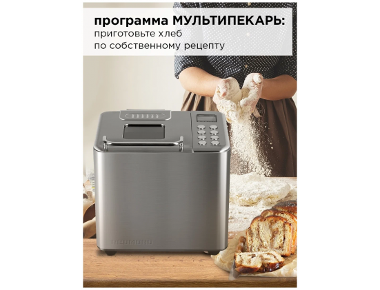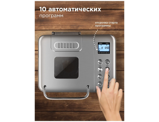 Программы - французский хлеб, цельнозерновой хлеб, сдоба, безглютеновый хлеб, кекс, бисквит, йогурт, ржаной хлеб, мультипекарь, молочная каша, основной хлеб, тушение, расстойка и выпечка, быстрый хлеб, варка, суп, джем, замес с изменением времени, дрожжевое тесто