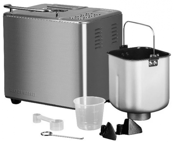 Комплектация - мерный стакан, лопасть для замешивания теста, хлебопечь, крючок для извлечения лопасти, книга «50 рецептов», мерная ложка
