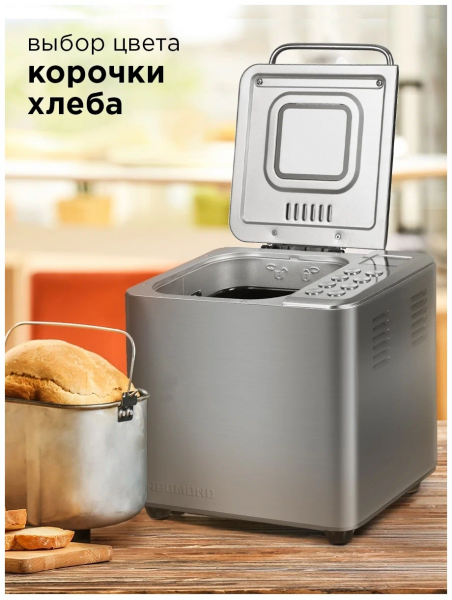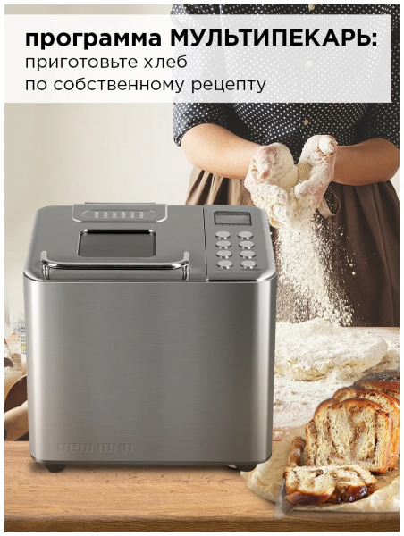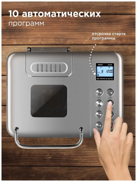 Программы - французский хлеб, цельнозерновой хлеб, сдоба, безглютеновый хлеб, кекс, бисквит, йогурт, ржаной хлеб, мультипекарь, молочная каша, основной хлеб, тушение, расстойка и выпечка, быстрый хлеб, варка, суп, джем, замес с изменением времени, дрожжевое тесто