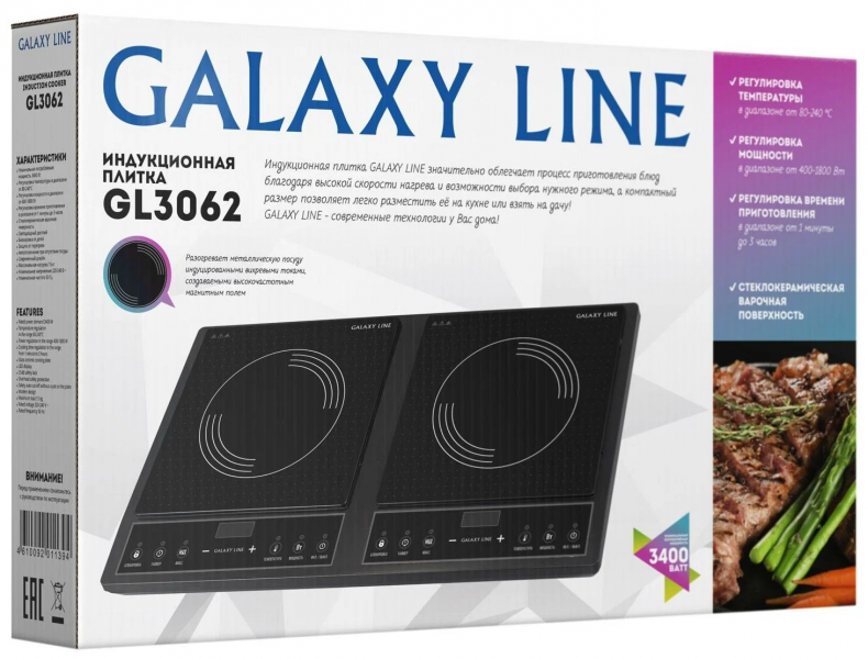 Дополнительная информация - регулировка мощности от 400 до 1800 Вт, регулировка температуры от 80 до 240 °С, регулировка времени приготовления от 1 минуты до 3 часов, блокировка от детей, автоотключение при отсутствии посуды, максимальная нагрузка 15 кг