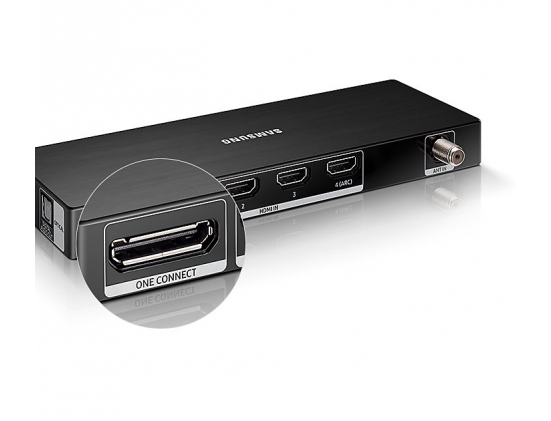 Блок One Connect - все кабелb подключаются к единому блоку. Все ваши кабели аккуратно подключены в блоку расширения. Задняя стенка телевизора гладкая, потому что все подключения к телевизору спрятаны внутрь.