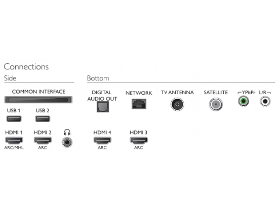 Входы - компонентный, HDMI x4, MHL, USB x2, Ethernet (RJ-45), Bluetooth, Wi-Fi 802.11n